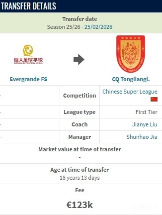 德转:重庆铜梁龙从恒大足校签下刘佳乐花费约100万人民币