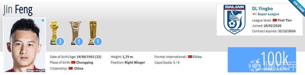 北京时间2月26日,德转更新,上海海港边锋冯劲租借加盟大连英博。