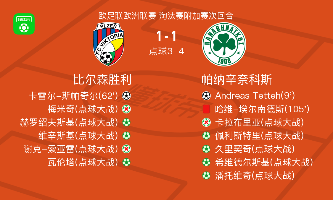 点球大战帕纳辛奈科斯5-4比尔森胜利,谢克-索亚雷失点