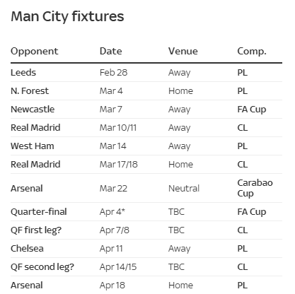 3月7日,曼城将客场对阵纽卡斯尔,随后将在3月10日或11日做客伯纳乌。3月14日,曼城客场对阵西汉姆。3月17日或18日,曼城将在主场对阵皇马。3月22日,曼城将在联赛杯决赛里对阵阿森纳。