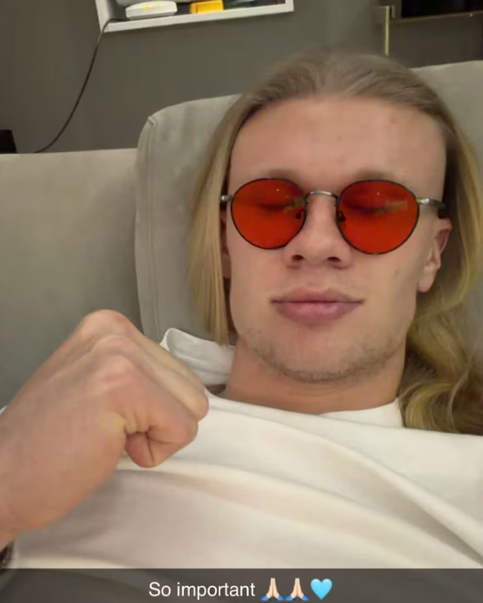虽然无法登场,但哈兰德的心情并未受影响。他在社交媒体上晒出一张照片:戴着醒目的红色墨镜,悠闲地躺在自家沙发上,配文"至关重要(So important)",远程庆祝球队的胜利。