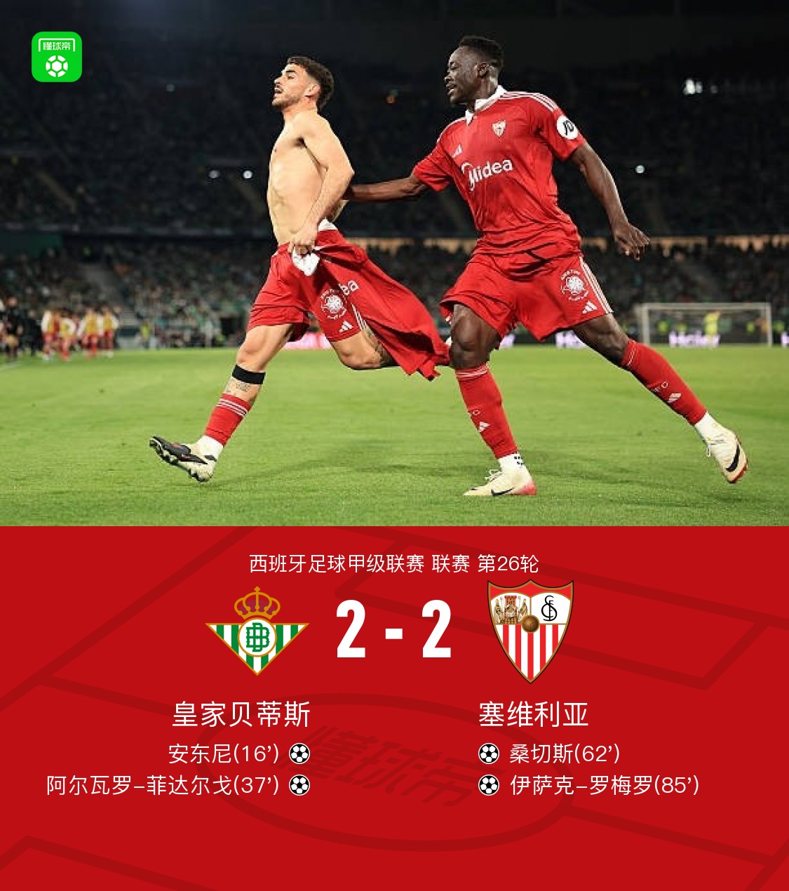 贝蒂斯2-2塞维利亚,安东尼倒钩技惊四座,罗梅罗扳平