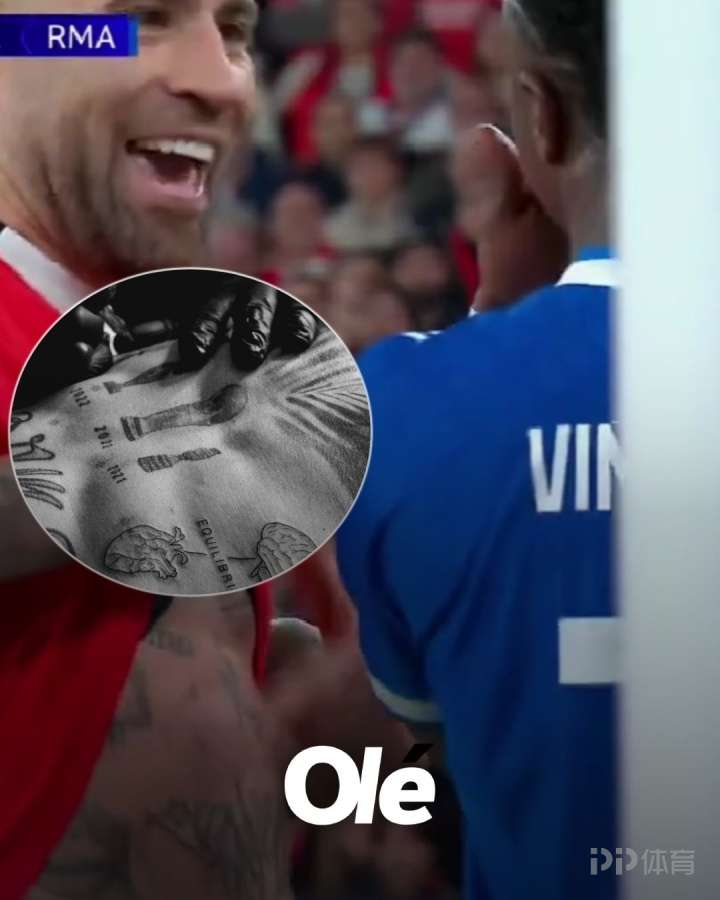 友好互动?奥塔门迪向维尼修斯展示世界杯冠军纹身 两人都笑了