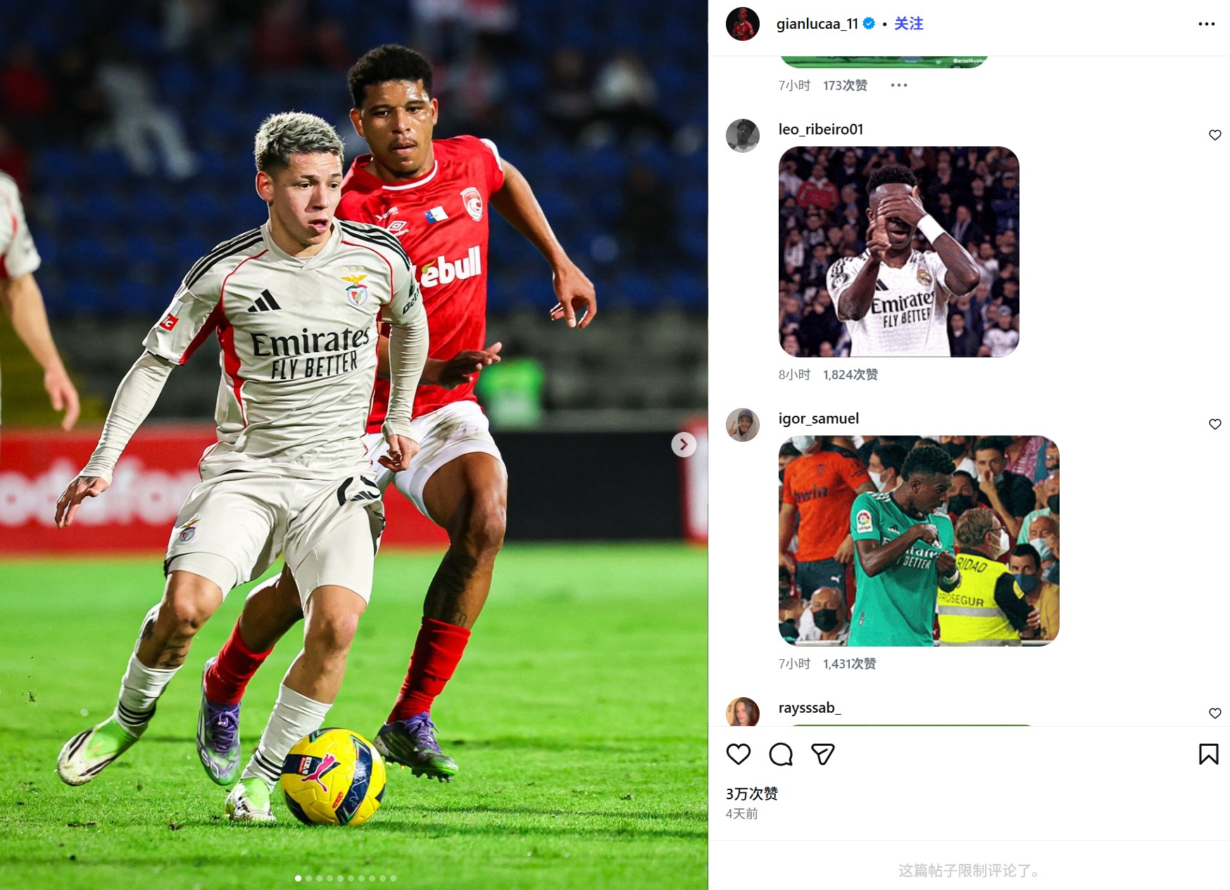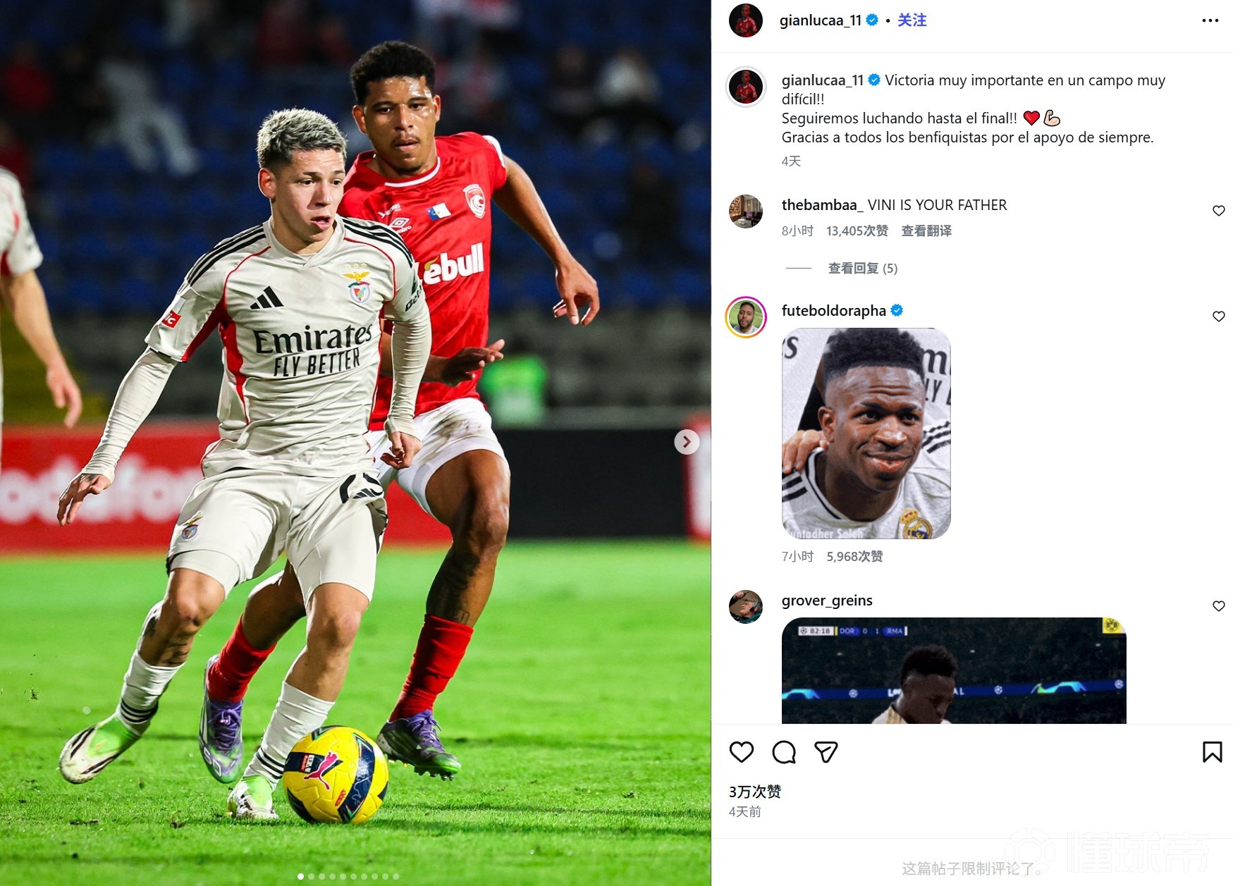 不过,球迷们似乎不太相信他说的话,在他社媒其他动态的评论区,众多网友刷关于维尼修斯的内容,比如“维尼修斯是你爹”的评论以及大量维尼修斯的照片和表情包,随后,普雷斯蒂安尼限制了他社媒动态的评论。