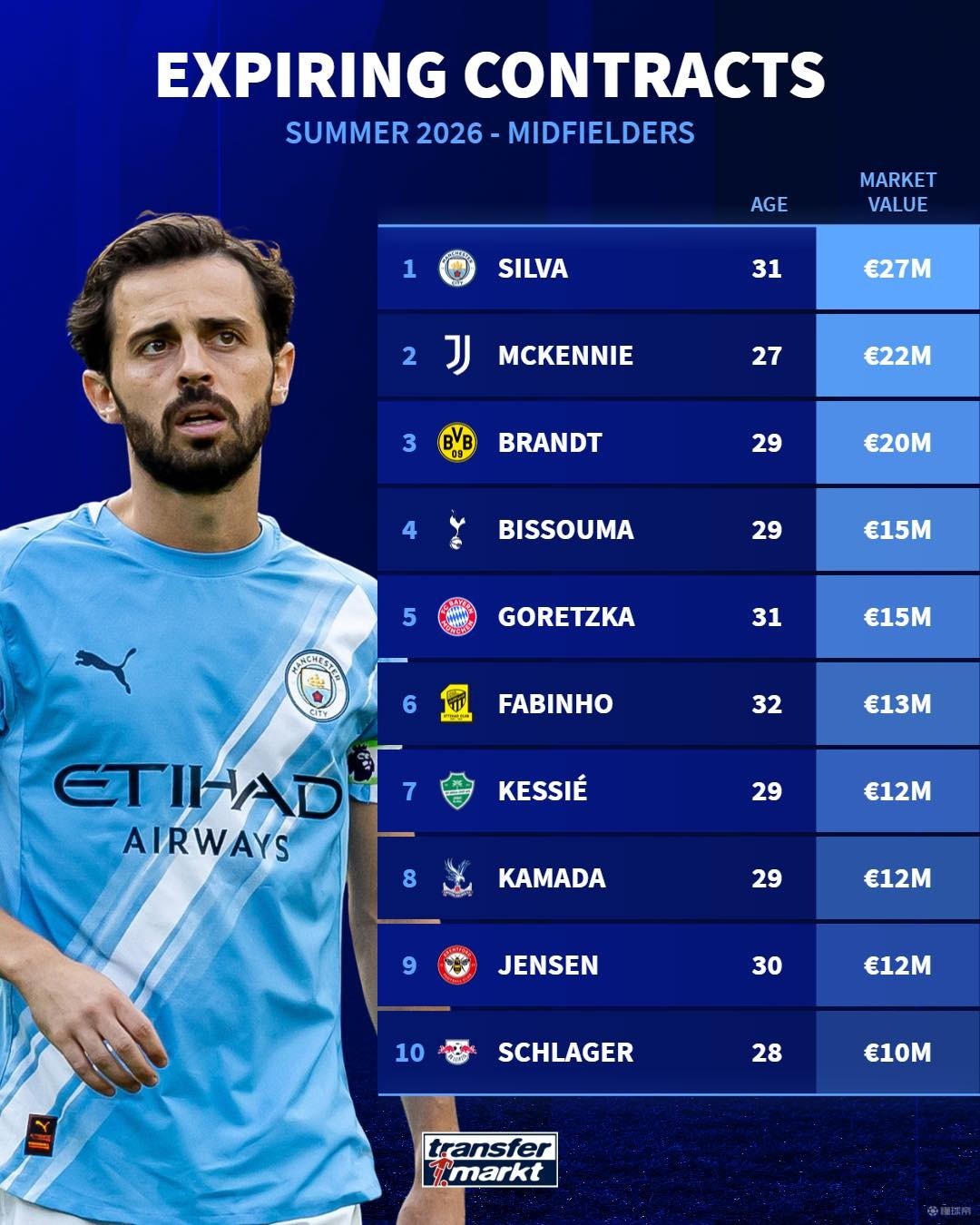 德国转会市场统计了今夏合同到期的十大中场,其中球员按照身价从高到低排序。