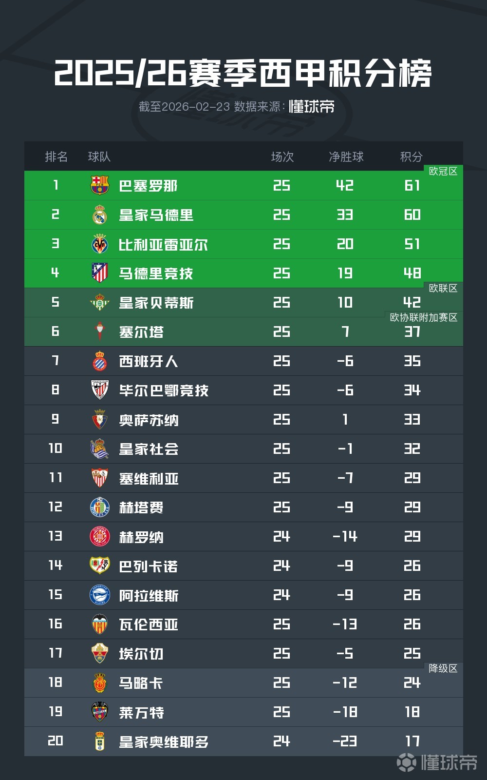 比利亚雷亚尔、马德里竞技分居积分榜第三、第四,目前身处欧冠区。皇家贝蒂斯排名第五处于欧联区。排名第六的塞尔塔领先西班牙人2分身处欧协联附加赛区。