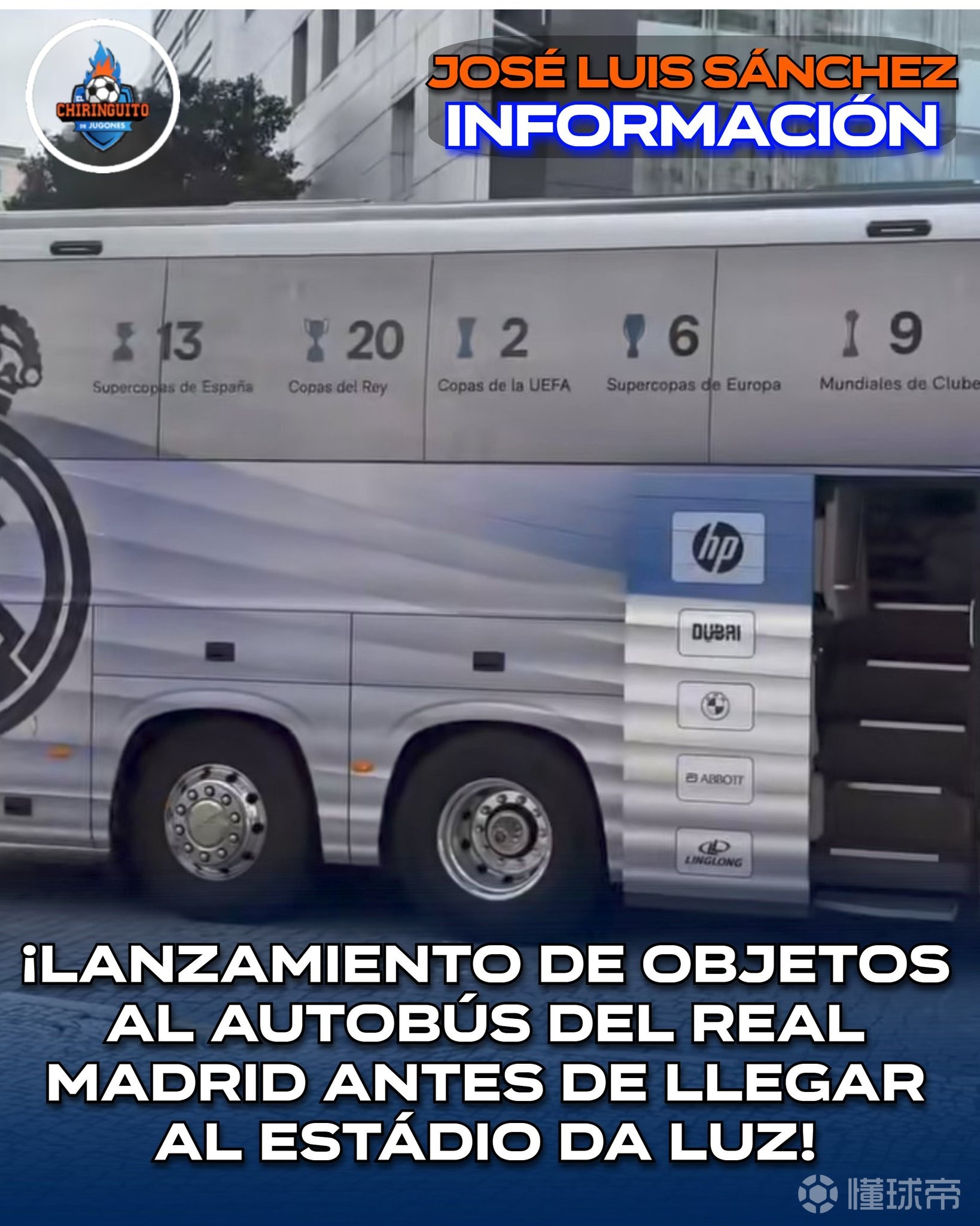 北京时间2月18日,根据西班牙六台El Chiringuito TV的报道,皇家马德里全队乘坐的大巴在前往光明球场的路上遭到了本菲卡球迷的攻击。