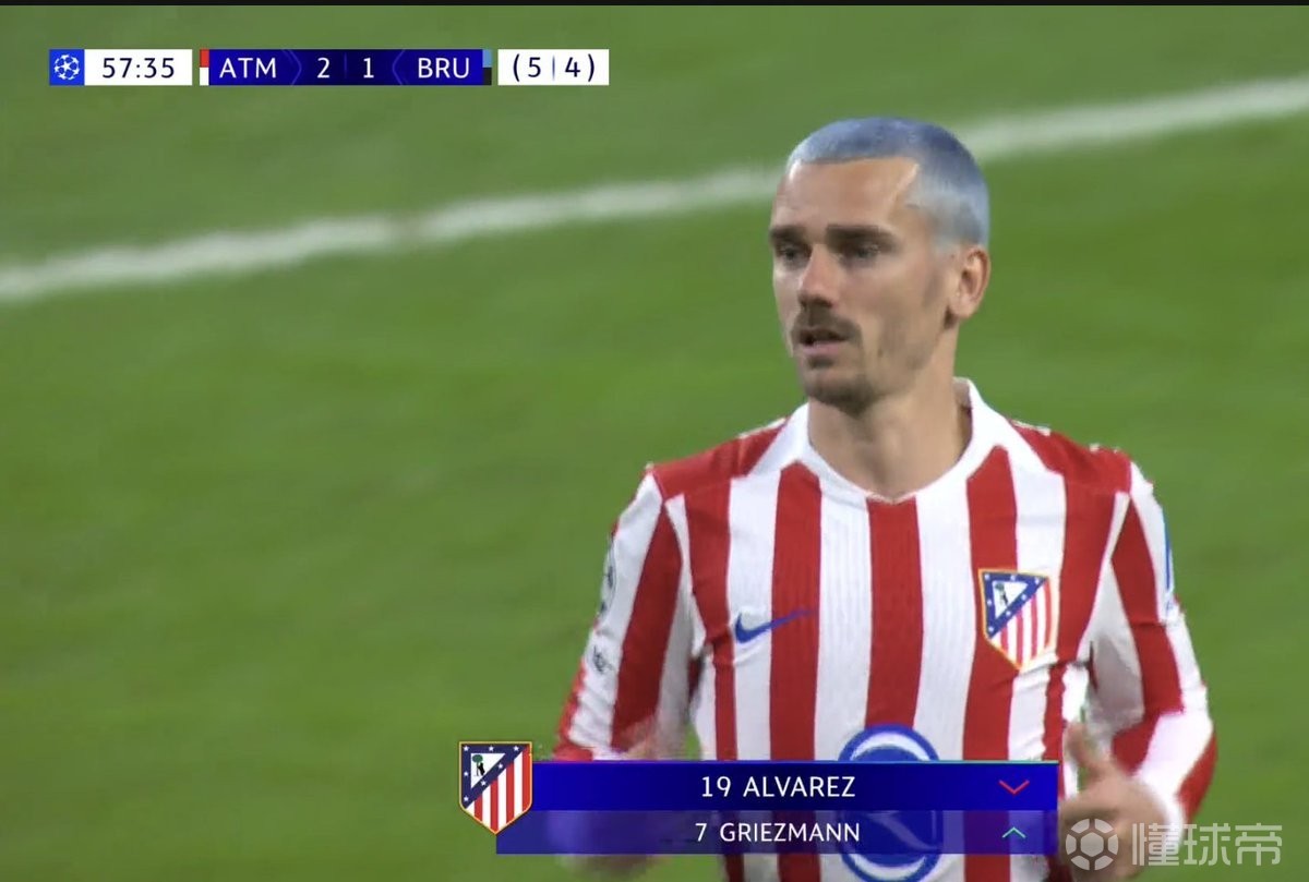 北京时间2月25日,在欧冠淘汰赛附加赛次回合马德里竞技主场与布鲁日的比赛中,格列兹曼第58分钟替补胡利安-阿尔瓦雷斯出场。