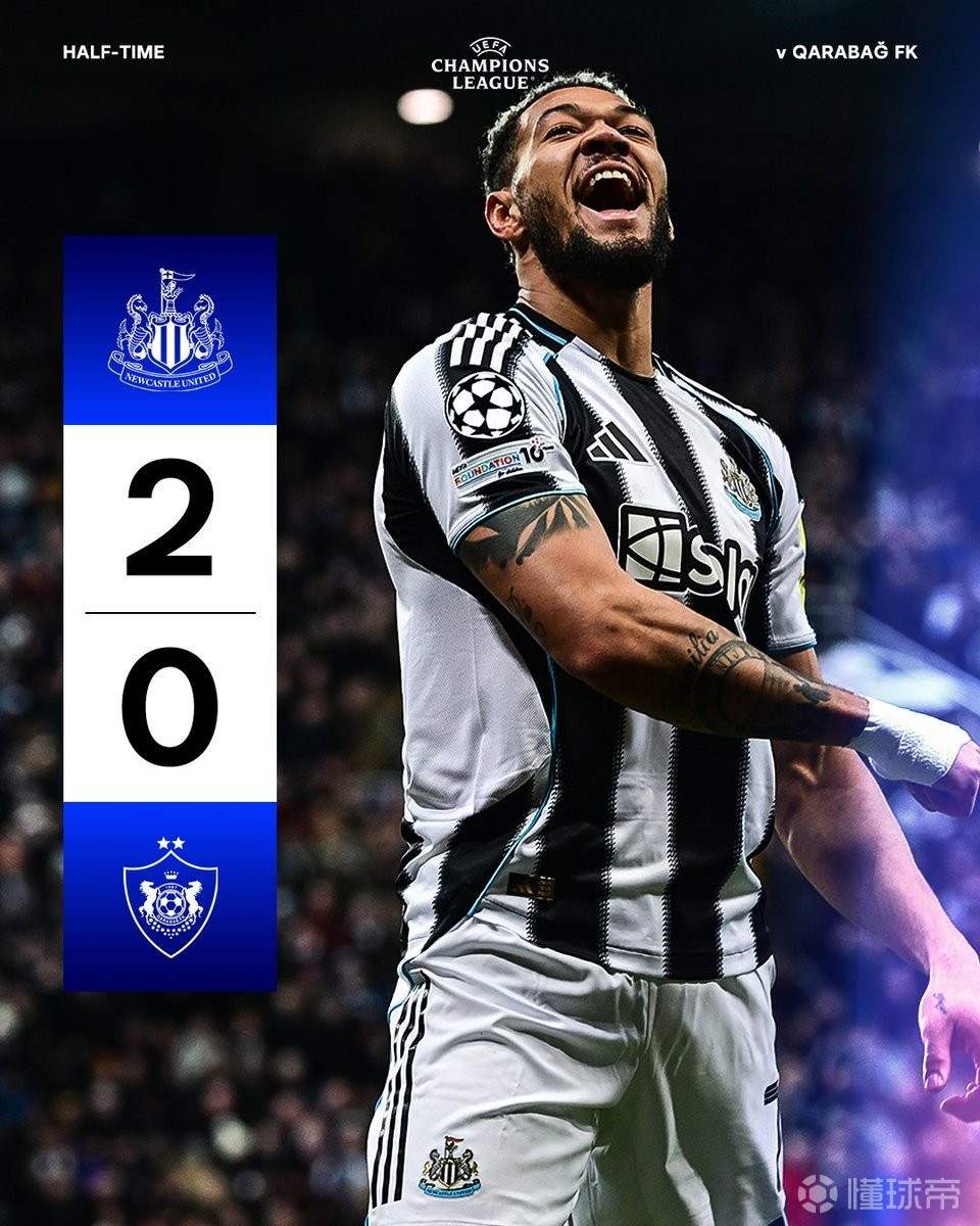 北京时间2月25日,在欧冠淘汰赛附加赛次回合的比赛中,纽卡斯尔联半场过后主场2-0领先于卡拉巴赫,托纳利和乔林顿开场6分钟内打入两球,目前喜鹊军团两回合总比分8-1领先于对手。