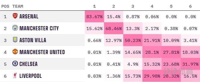 数据机构Opta的超级计算给出了最新的排名预测:阿森纳赢下北伦敦德比后,夺冠概率回升至83.67%,曼城则是15.62%。