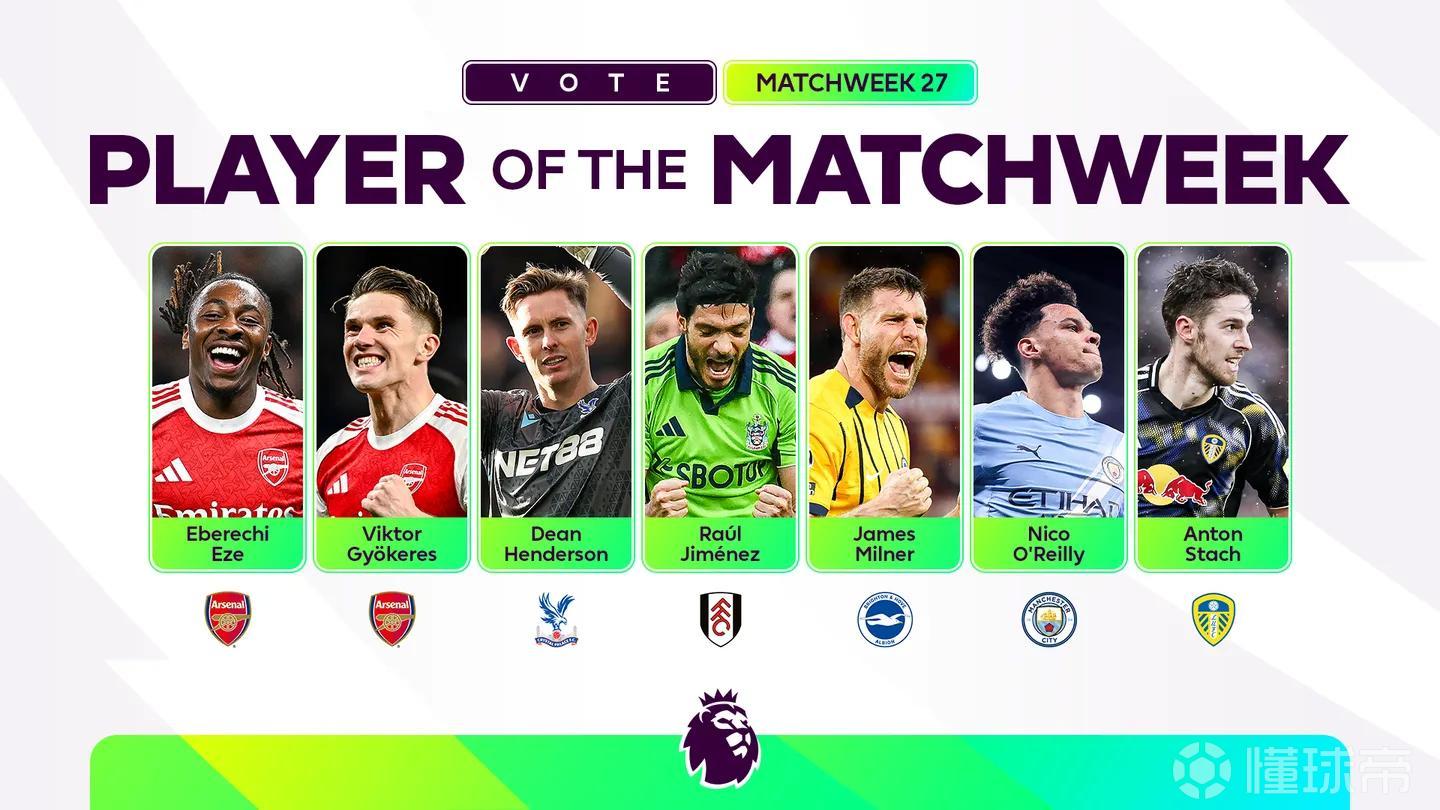 北京时间2月24日,英超官方公布了联赛第27轮最佳球员候选名单,这7名球员为埃泽、哲凯赖什、迪恩-亨德森、劳尔-希门尼斯、米尔纳、奥赖利、施塔赫。