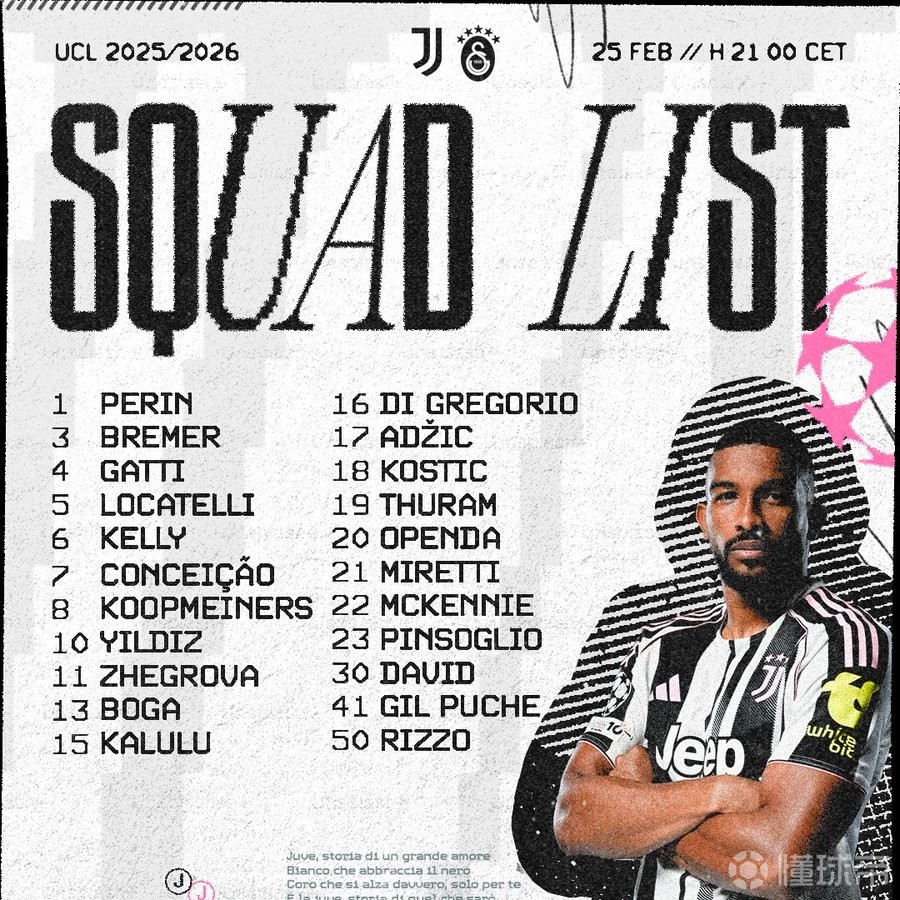尤文vs加拉塔萨雷大名单:伊尔迪兹领衔,布雷默、卡卢卢回归