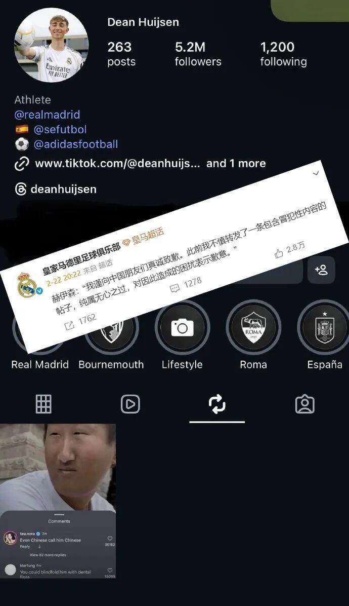 撰稿/寒冰2月21日,皇马后卫赫伊森在个人社媒转发涉及“辱华”内容多图动态被曝光,尽管他删除了这一动态,但争议并未就此平息。2月22日,皇马官方微博账号发布了50余字的道歉声明,但并未同步到更具有国际影响力的皇马官方网站以及皇马官方在Facebook、X、IG等国际平台社媒,当事人赫伊森也未在个人社媒账号道歉。