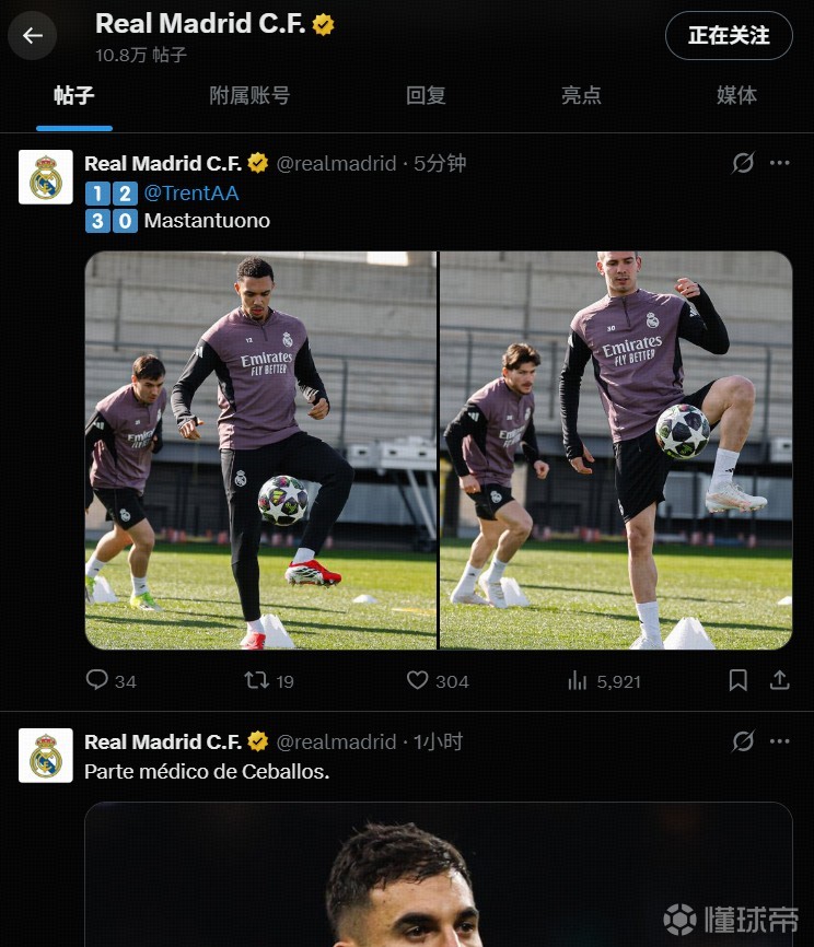 皇马官推在这条道歉消息发布后更新了阿诺德和马斯坦托诺的训练照,此前公布了塞瓦略斯的伤情公告。