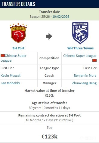 德转显示,明天从上海海港加盟武汉三镇的转会费约100万人民币。
