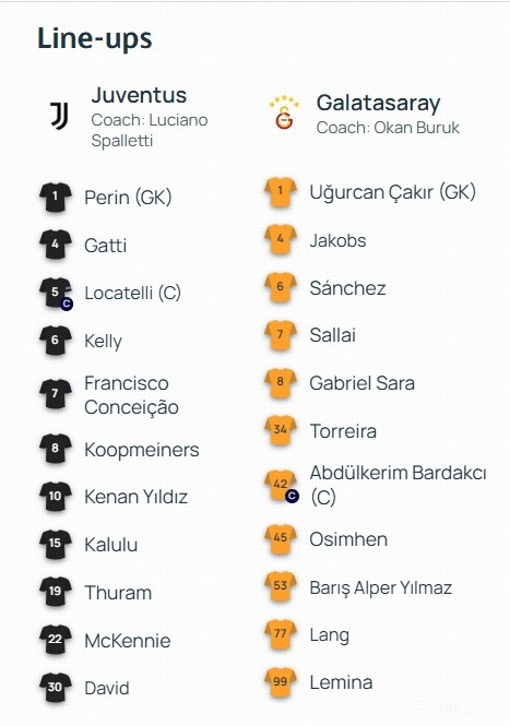 尤文首发:1-佩林、4-加蒂、15-卡卢卢、6-凯利、19-图拉姆、22-麦肯尼、8-库普梅纳斯、5-洛卡特利、10-伊尔迪兹、7-孔塞桑、30-戴维