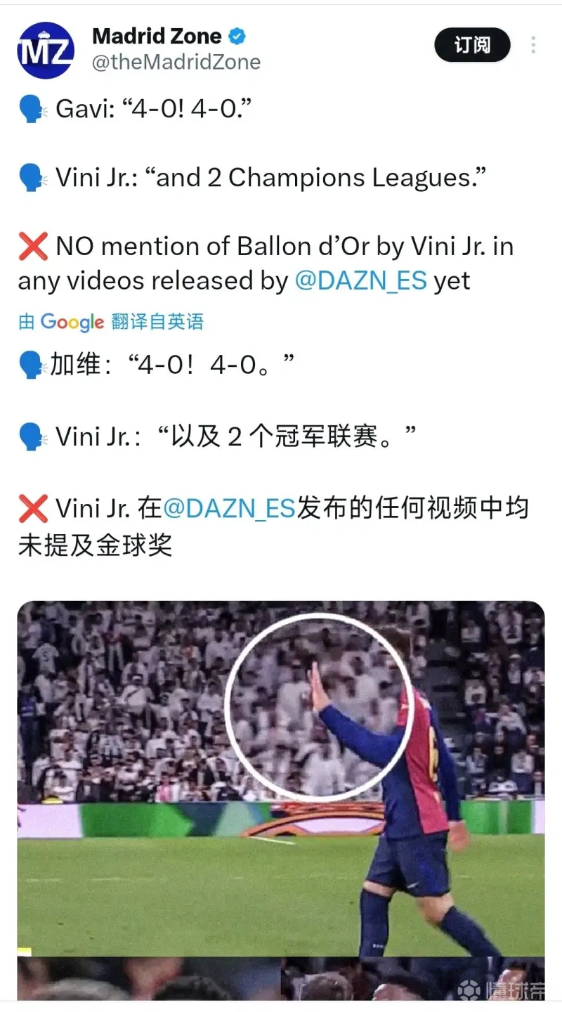 唇语解读,母语解读者也容易出现偏差的案例:维尼修斯回击加维时间倒回2024/2025赛季西甲第11轮,西甲首回合国家德比,皇马主场0-4不敌巴萨。比赛中,加维向维尼修斯比出四个手指,意为巴萨4-0皇马,而维尼修斯则通过言语回击。维尼修斯到底对加维说了什么,西班牙媒体给出了两个解读。第一,西班牙六台记者何塞-阿尔瓦雷斯-阿亚的解读——维尼修斯(维尼修斯长期在西班牙生活,会说流利的西班牙语)回击:“是是是,但我周一要去领金球奖了。”不巧的是,维尼修斯没有获得那年金球奖,罗德里获得。周一去领金球奖的梗就是这样来的。然而,却有西班牙语媒体解读出另一个版本,就是两个欧冠警告。(图2,为皇马的英文推特,转述引用的西班牙语评论)。维尼修斯到底有没有说过自己周一要去领奖呢?这恐怕也是一个悬案。