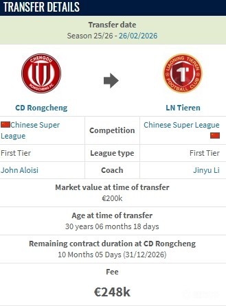 德转显示,元敏诚从成都蓉城加盟辽宁铁人的转会费约200万人民币。