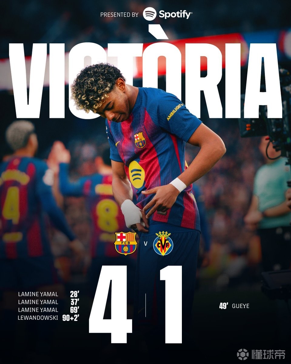 北京时间3月1日,在西甲第26轮的比赛中,亚马尔的帽子戏法和莱万多夫斯基的进球帮助巴塞罗那在主场4-1大胜比利亚雷亚尔,继续领跑联赛积分榜。