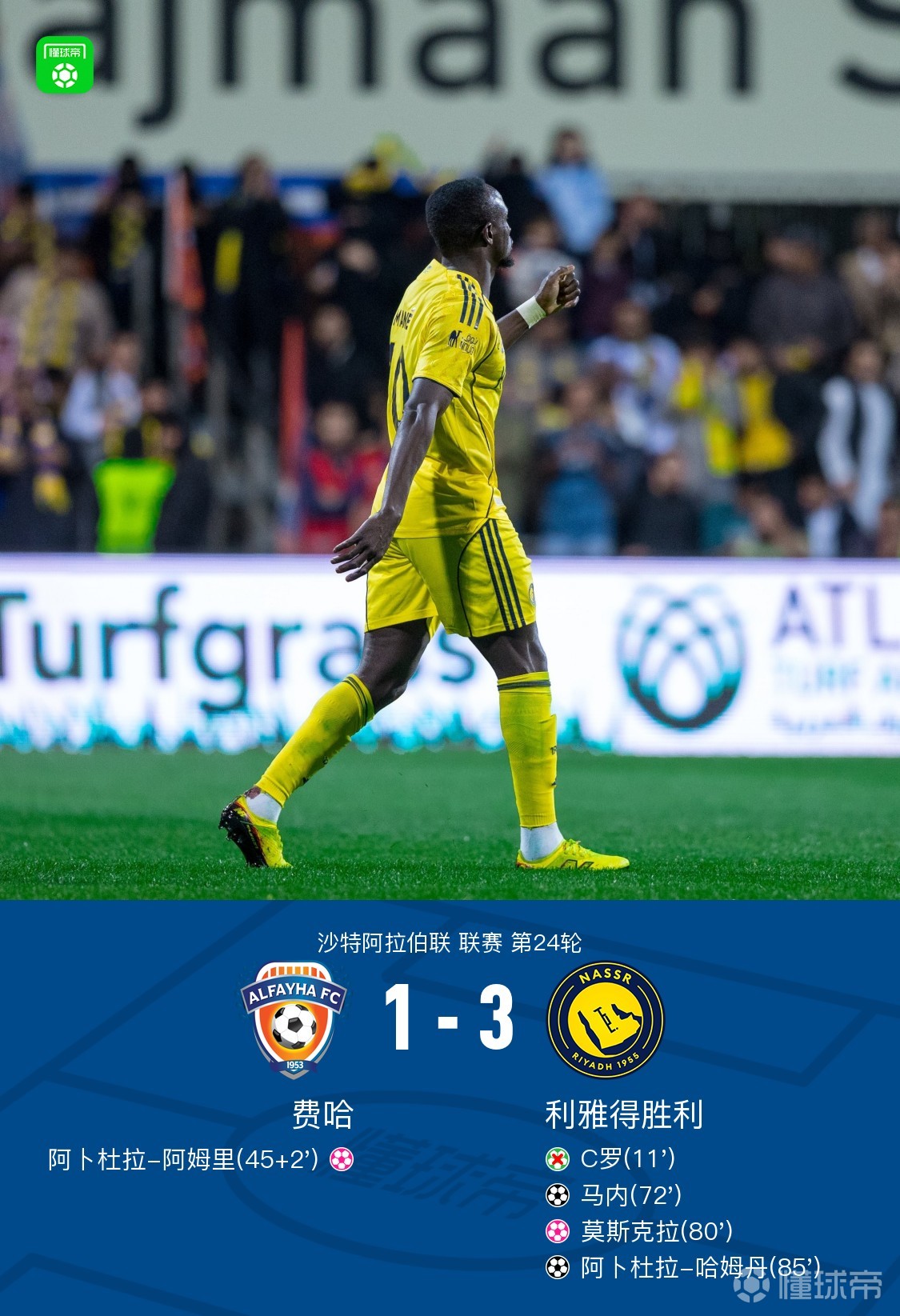 利雅得胜利3-1逆转费哈,C罗失点,马内建功