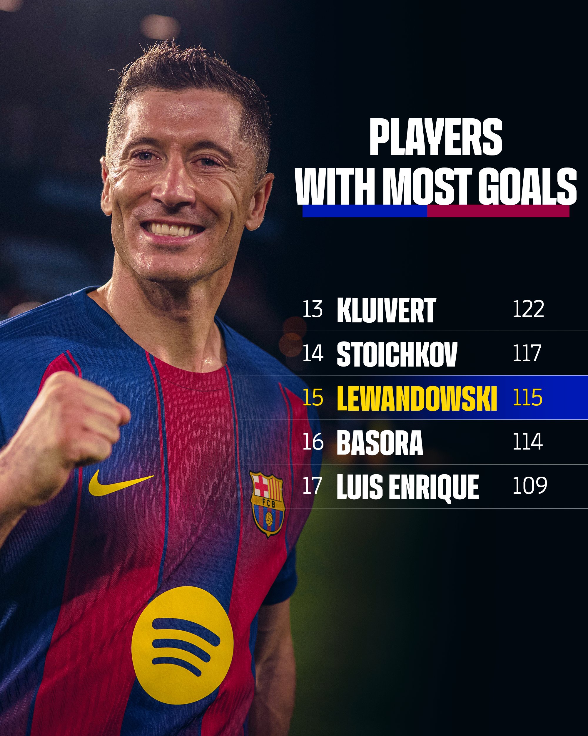 莱万已为巴萨打进115球,独享队史射手榜第15名