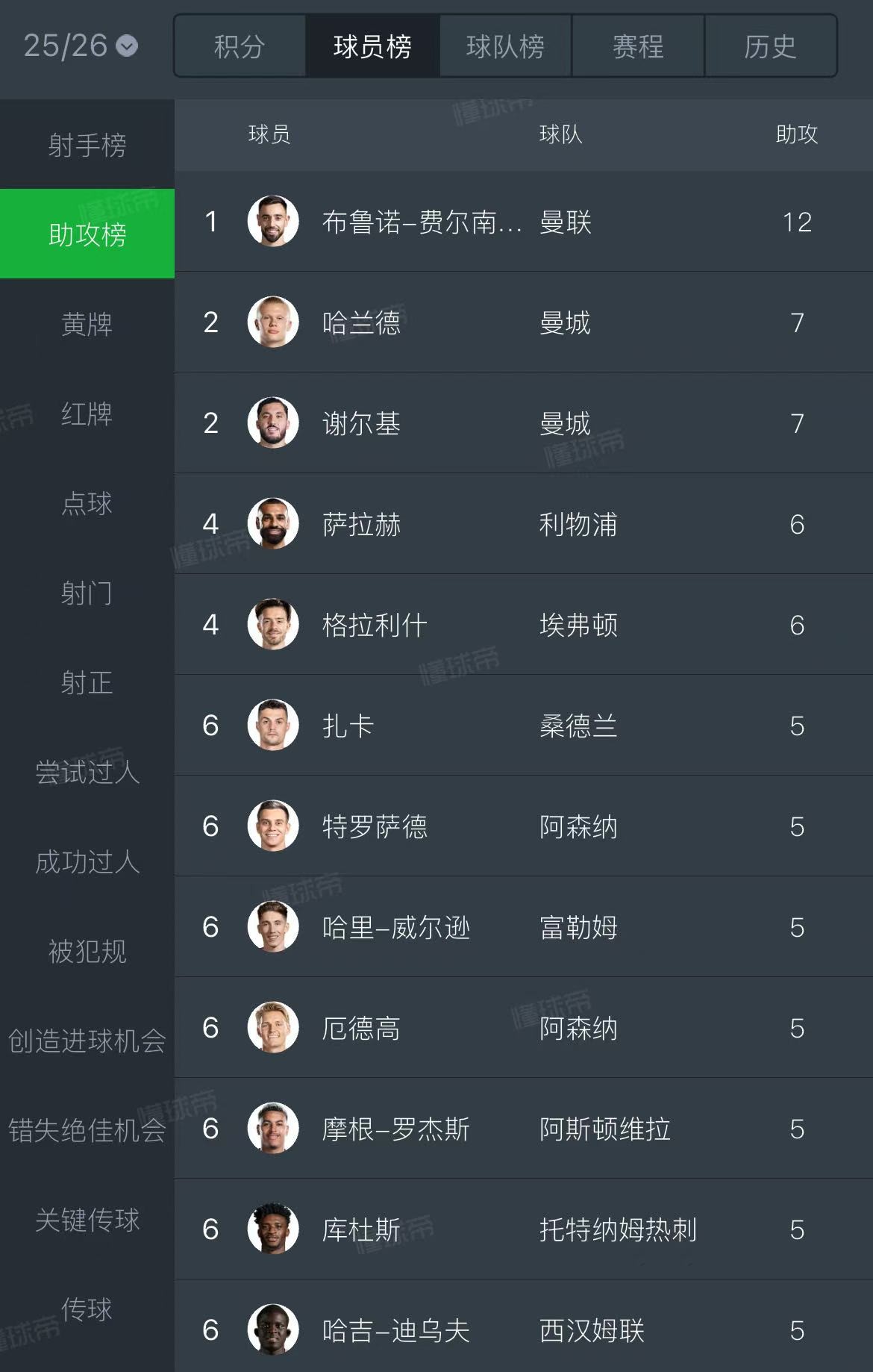 B费13次助攻在英超断档领先,哈兰德、谢尔基7次排在第二