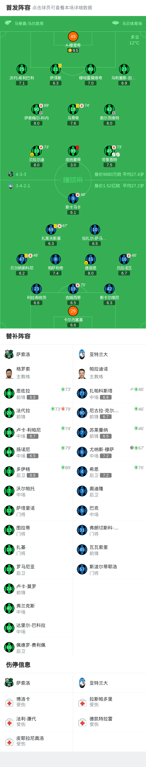 十人萨索洛2-1亚特兰大,索尔茨维特世界波,科内建功,穆萨破门