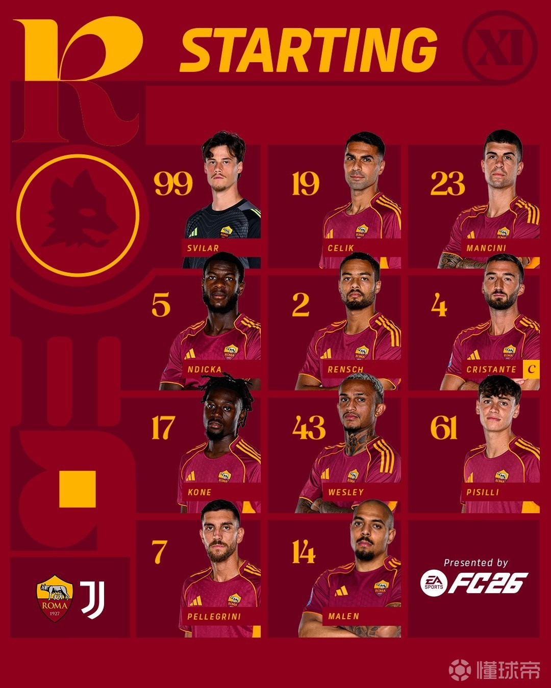 罗马首发:99-斯维拉尔、43-利马、2-伦施、5-恩迪卡、23-詹卢卡-曼奇尼、19-切利克、61-皮西利、17-科内、7-洛伦佐-佩莱格里尼、4-克里斯坦特、14-马伦